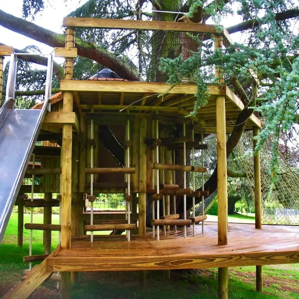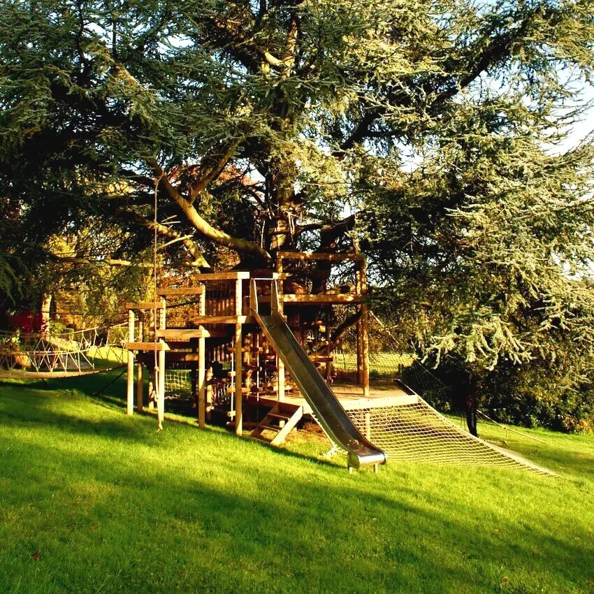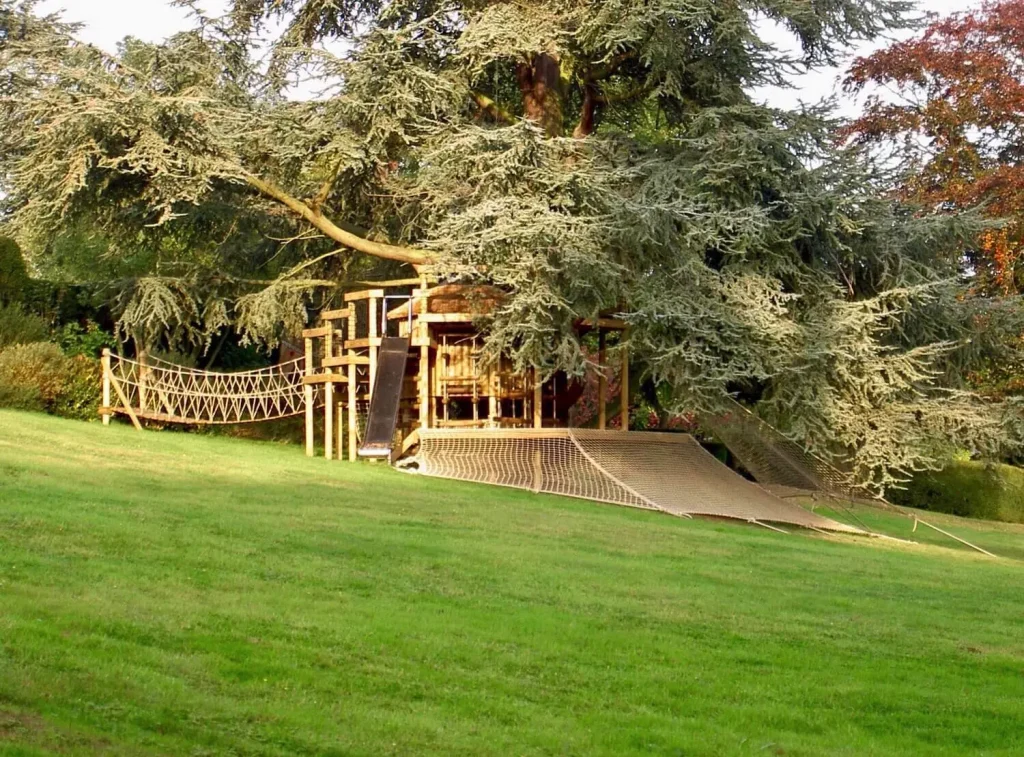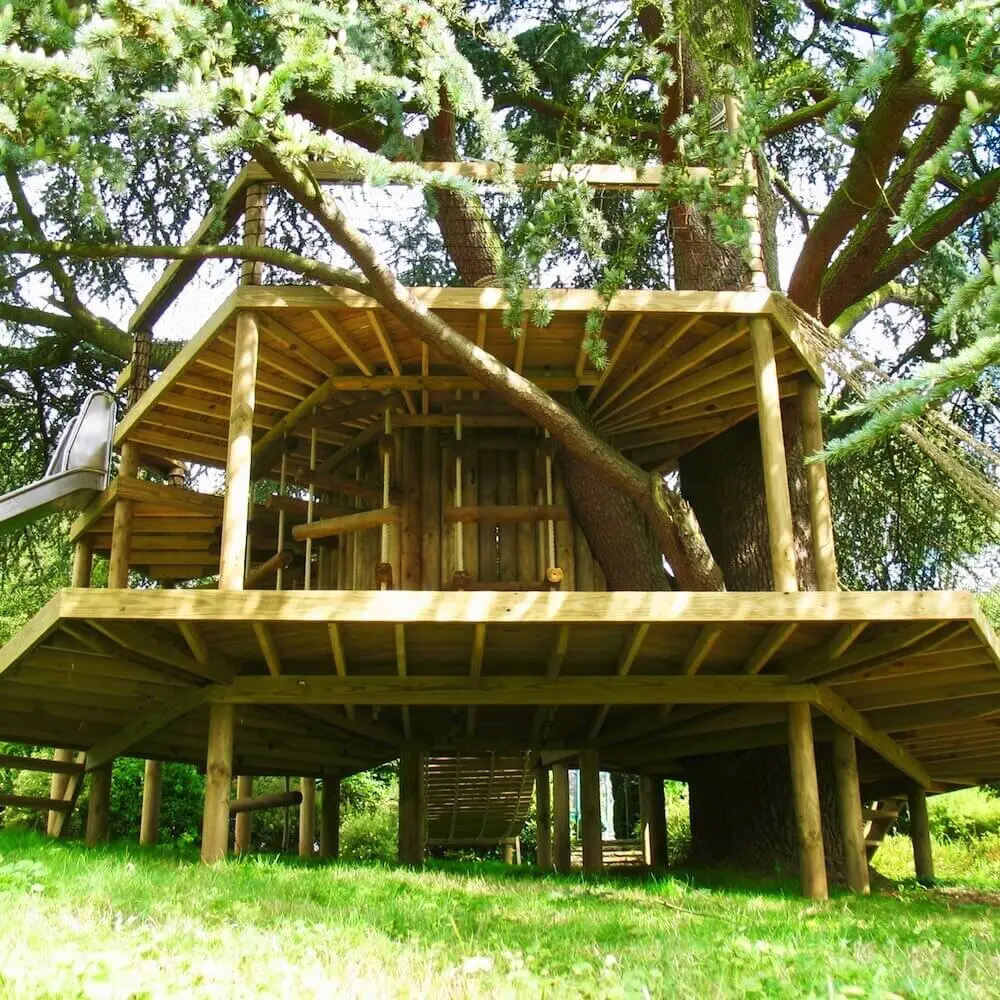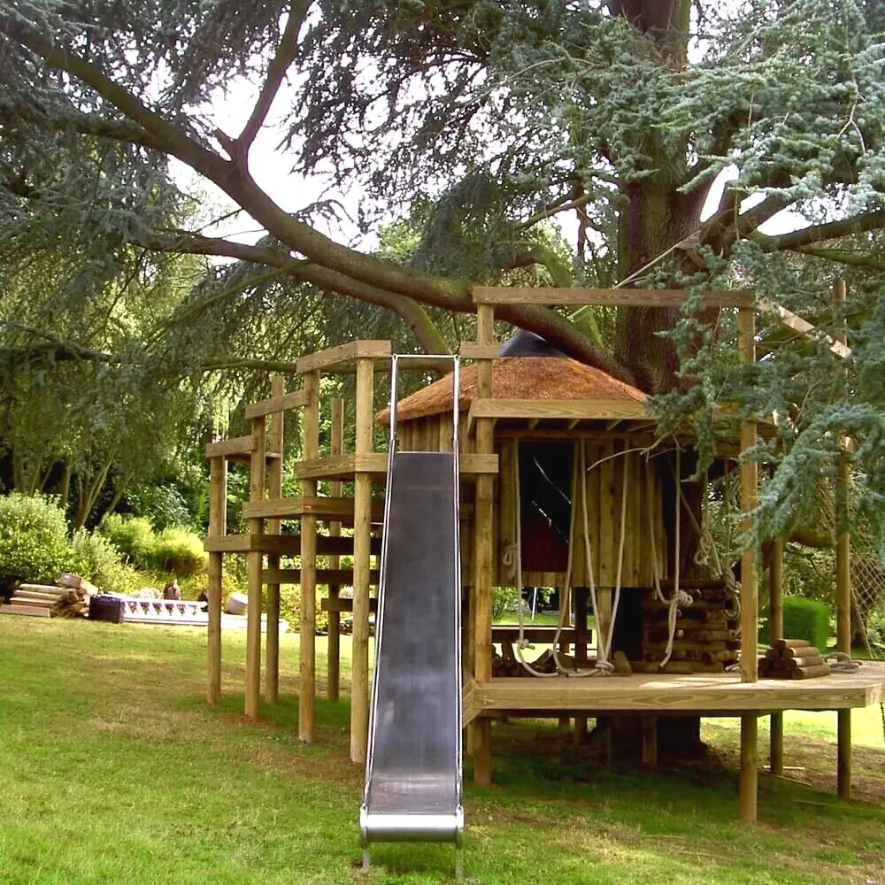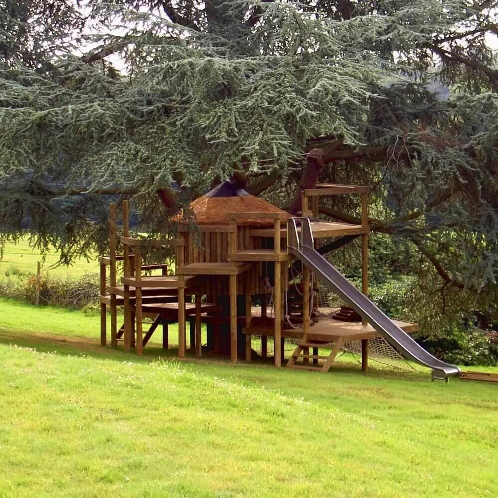 Spiralling play decks on 9 levels hugging a treehouse within a garden Blue Cedar.