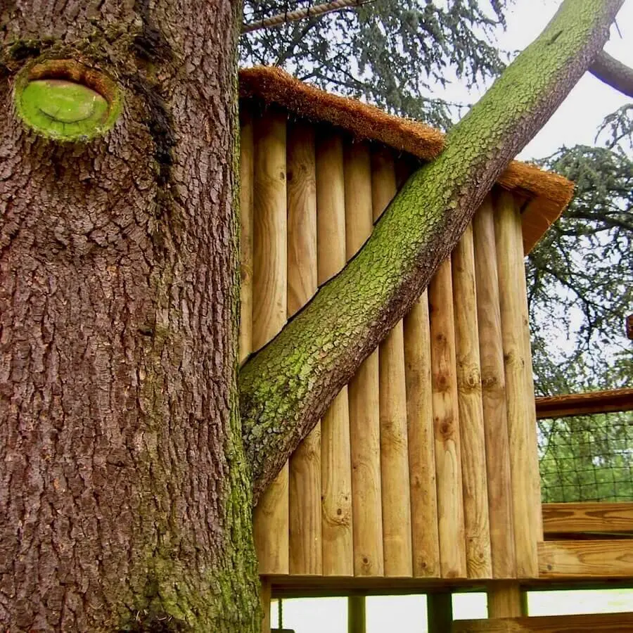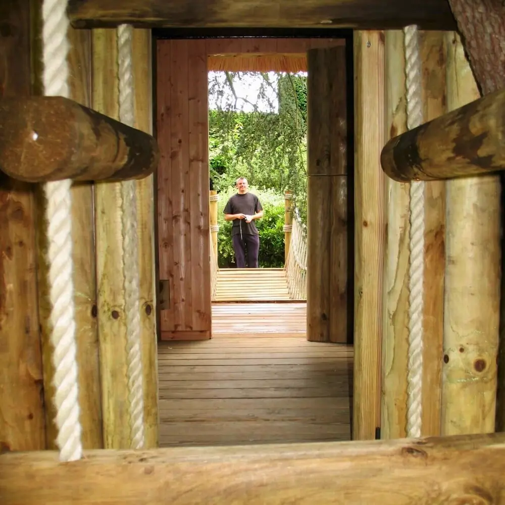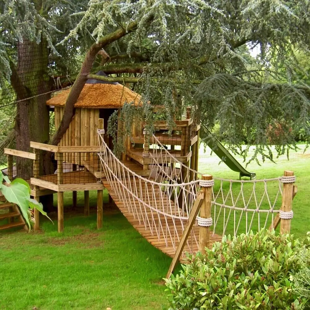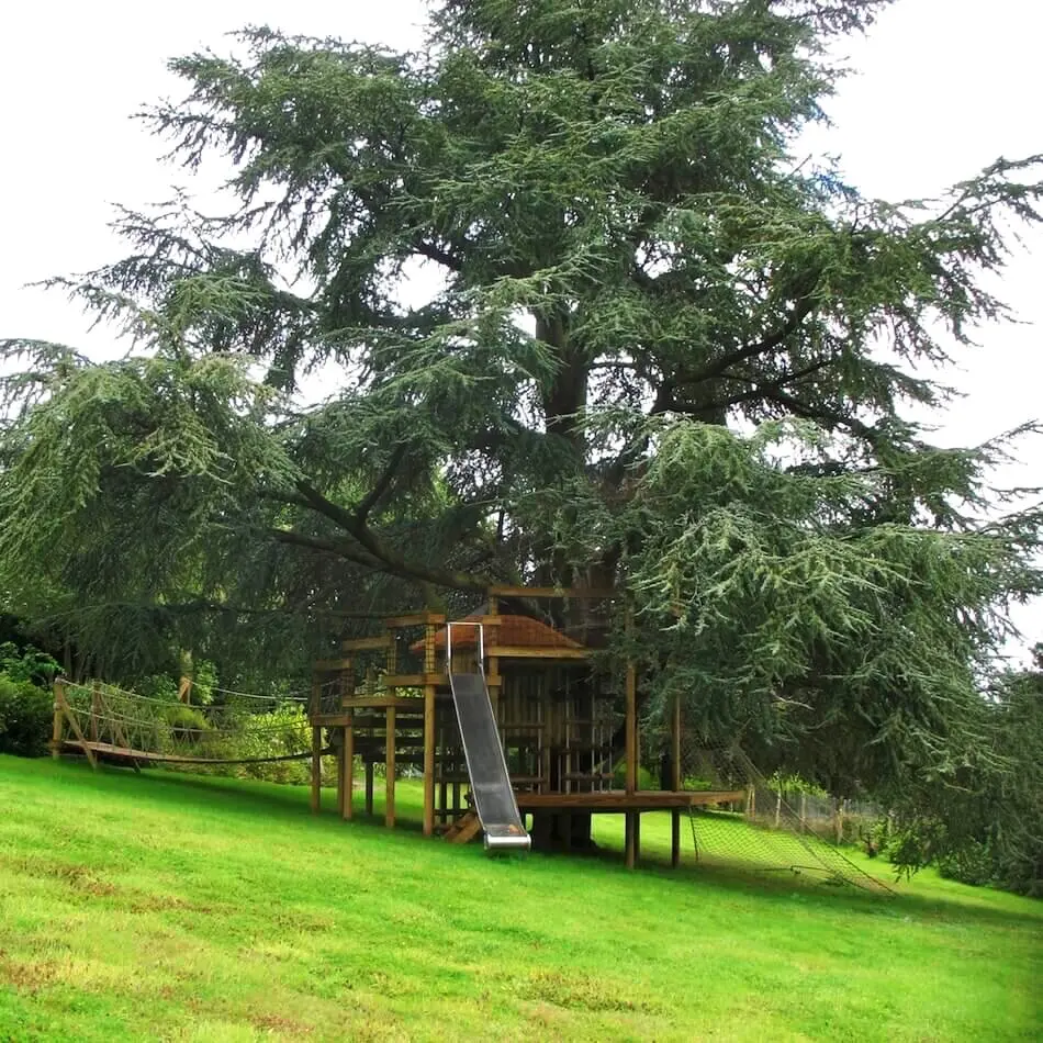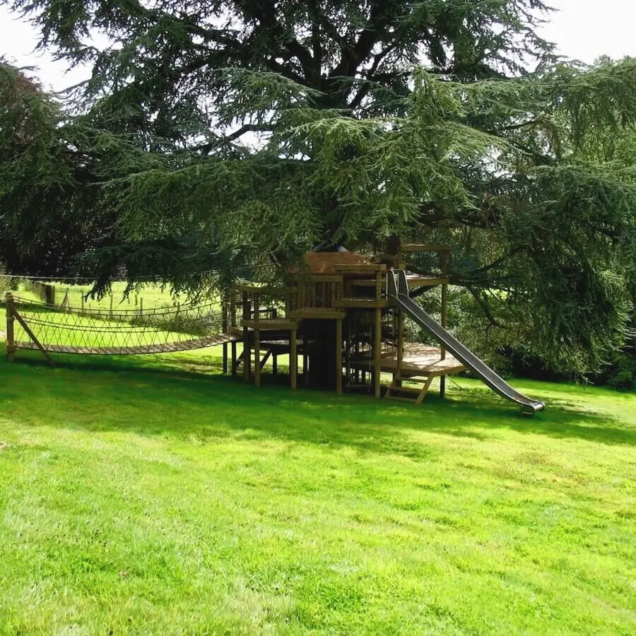 Spiralling play decks on 9 levels hugging a treehouse within a garden Blue Cedar.
