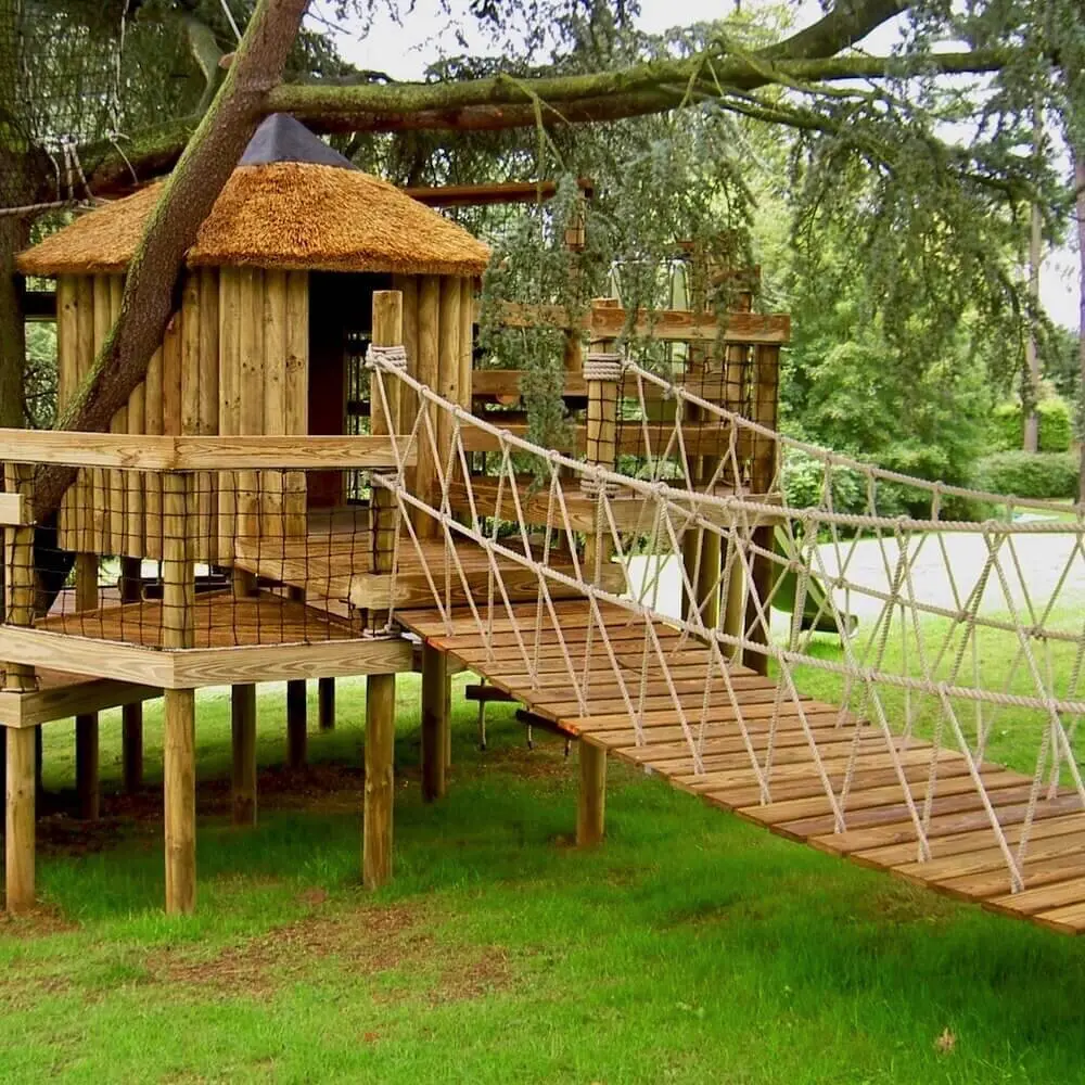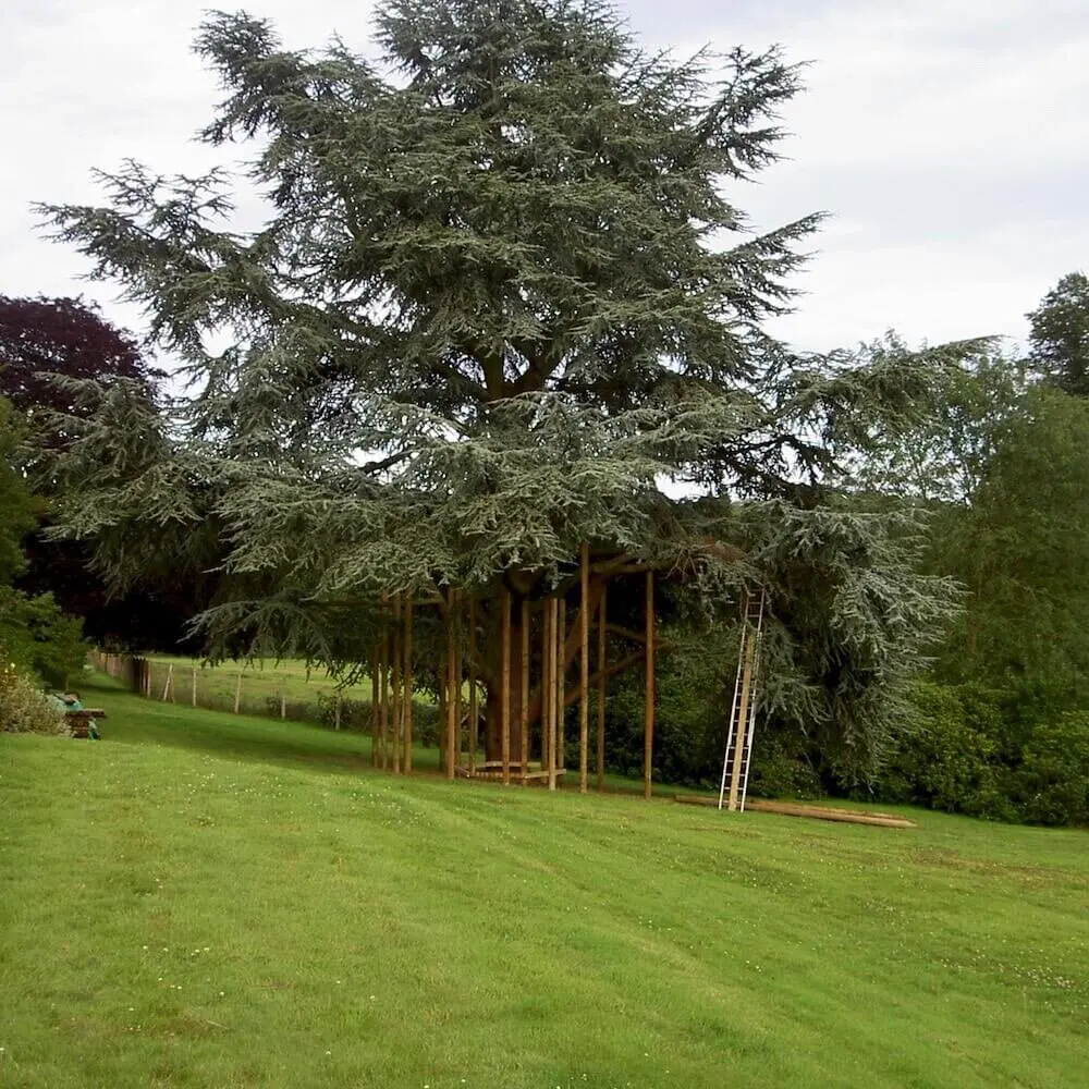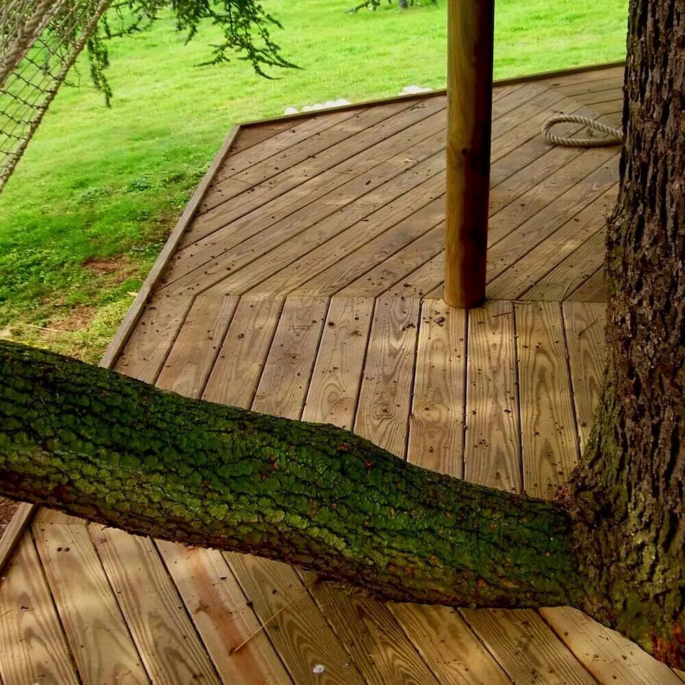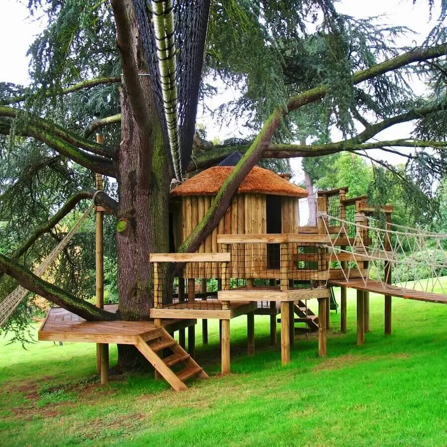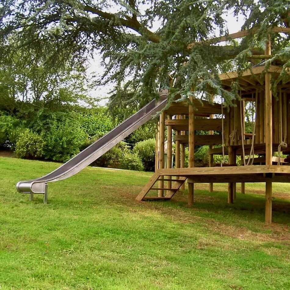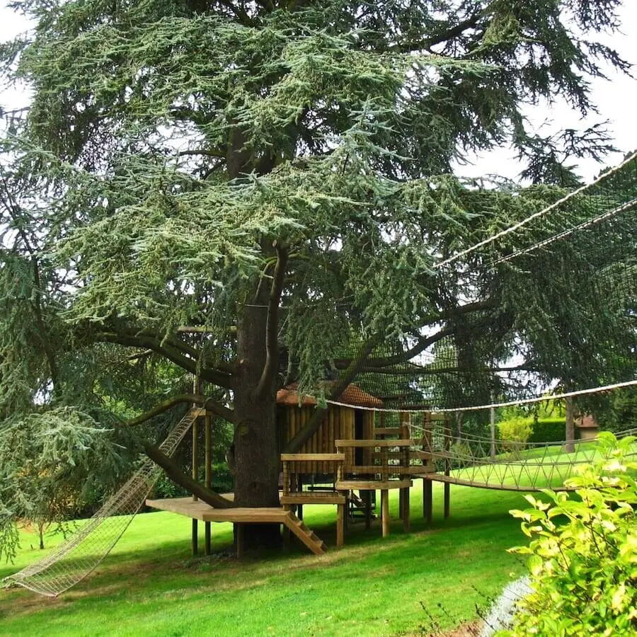 Spiralling play decks on 9 levels hugging a treehouse within a garden Blue Cedar.