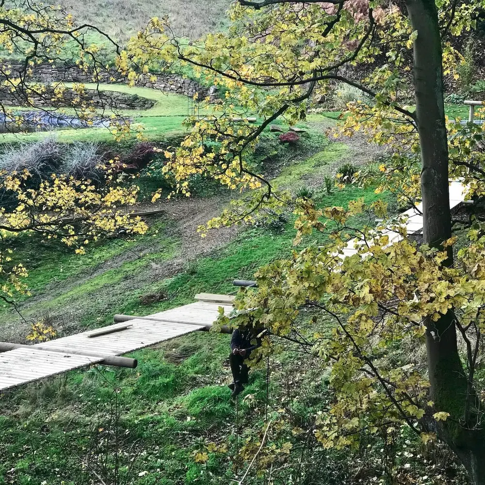 Our longest Rope Bridge in the UK. Completed the longest Rope Bridge in the UK at 42m in a private garden location from the formal back garden and out across a valley to a lakeside location with beautiful views.