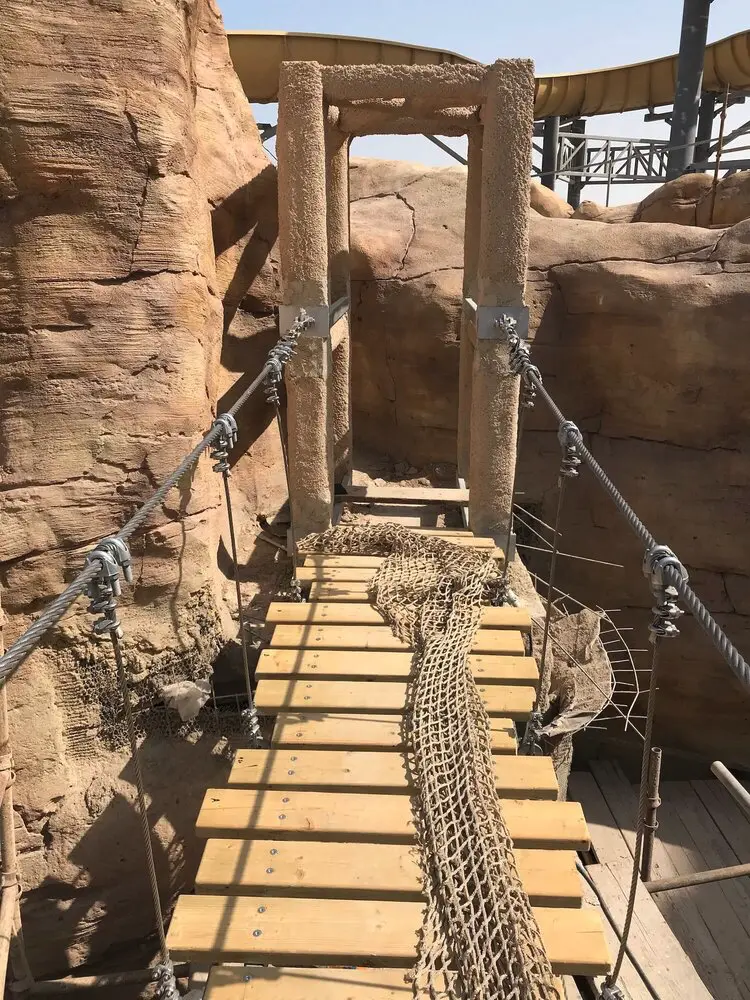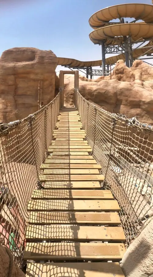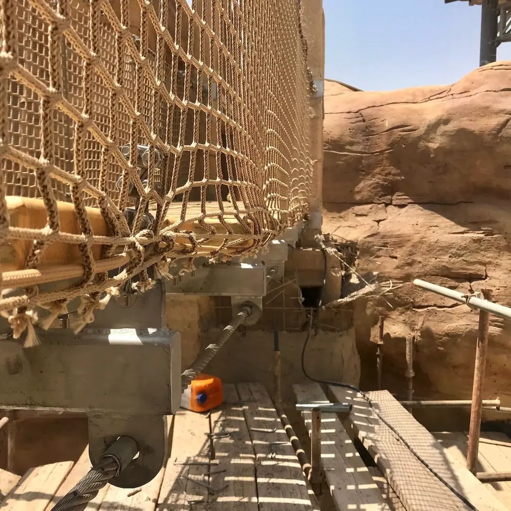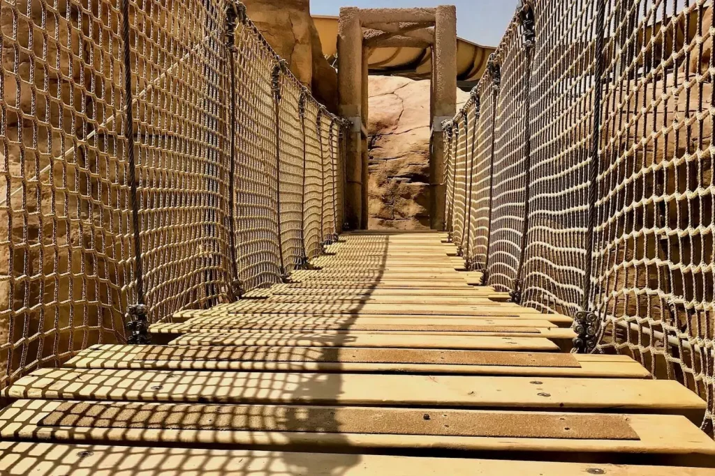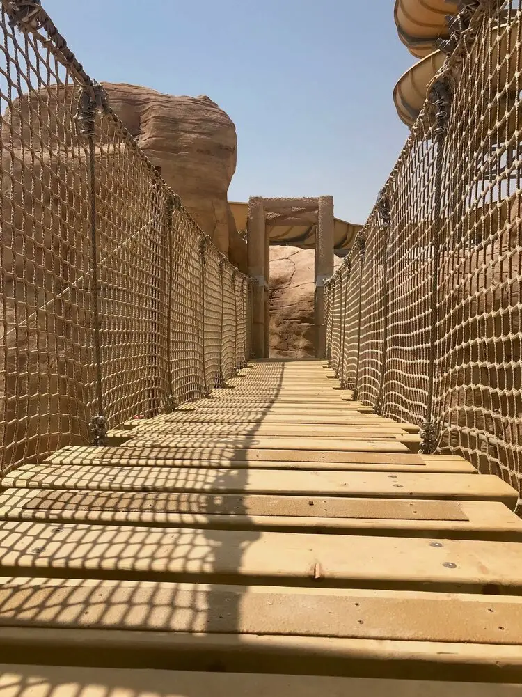 An Adventure Park Rope Bridge in the Middle-East. A superb project built within a desert canyon in the heat of Qatar. Designed to look like a wild jungle-style Rope Bridge this creation is made with high-quality ropes and professional-grade metal supports. Sitting on tensioned metal cables and fixings it is strong, safe and easy to use. Finished with neutral-coloured rope netting and ropes it adds to the jungle feel and fun.