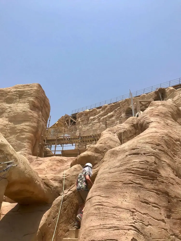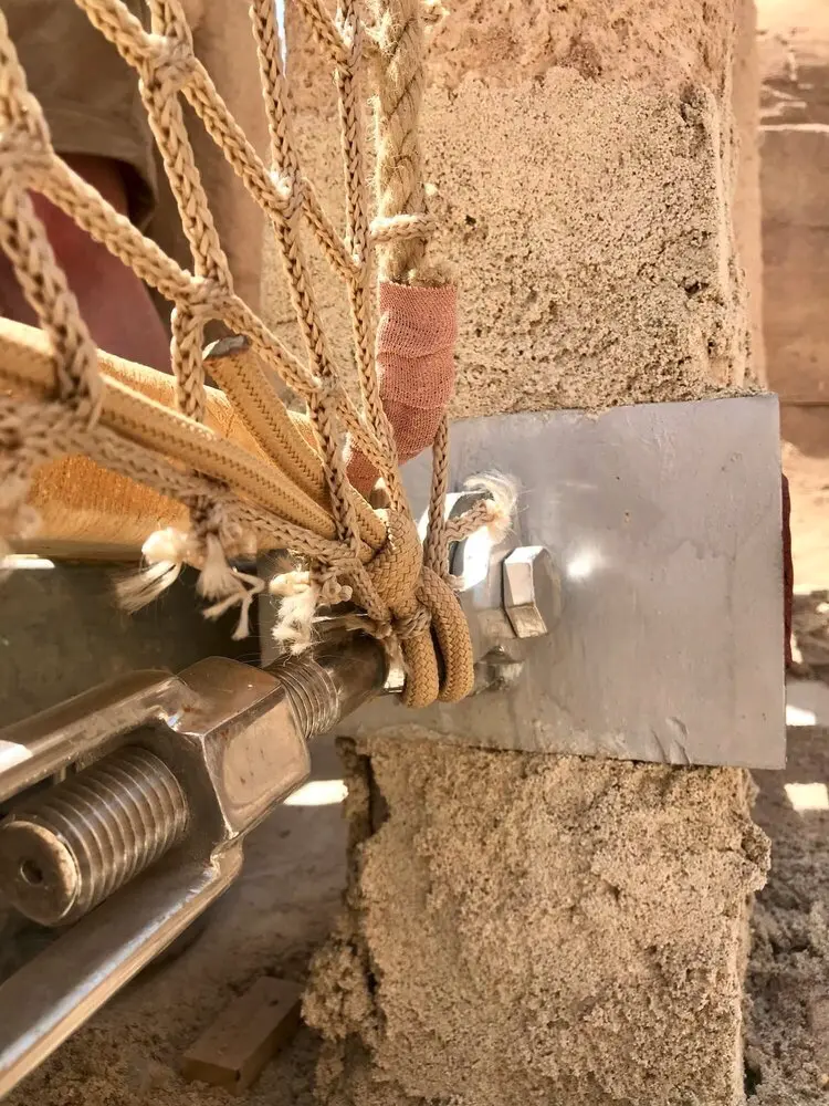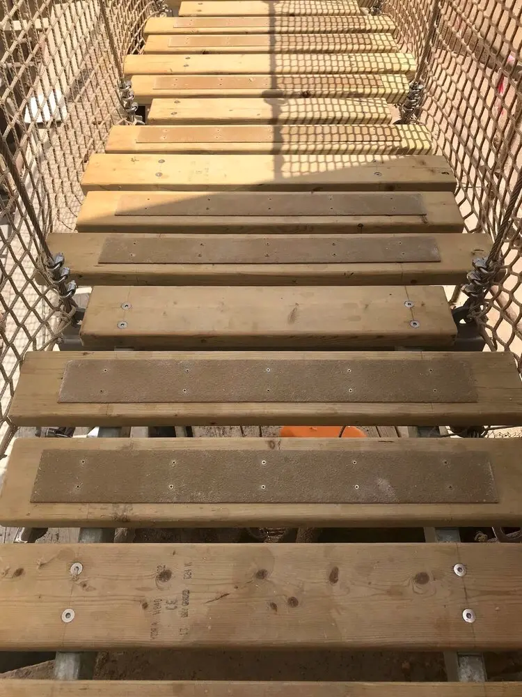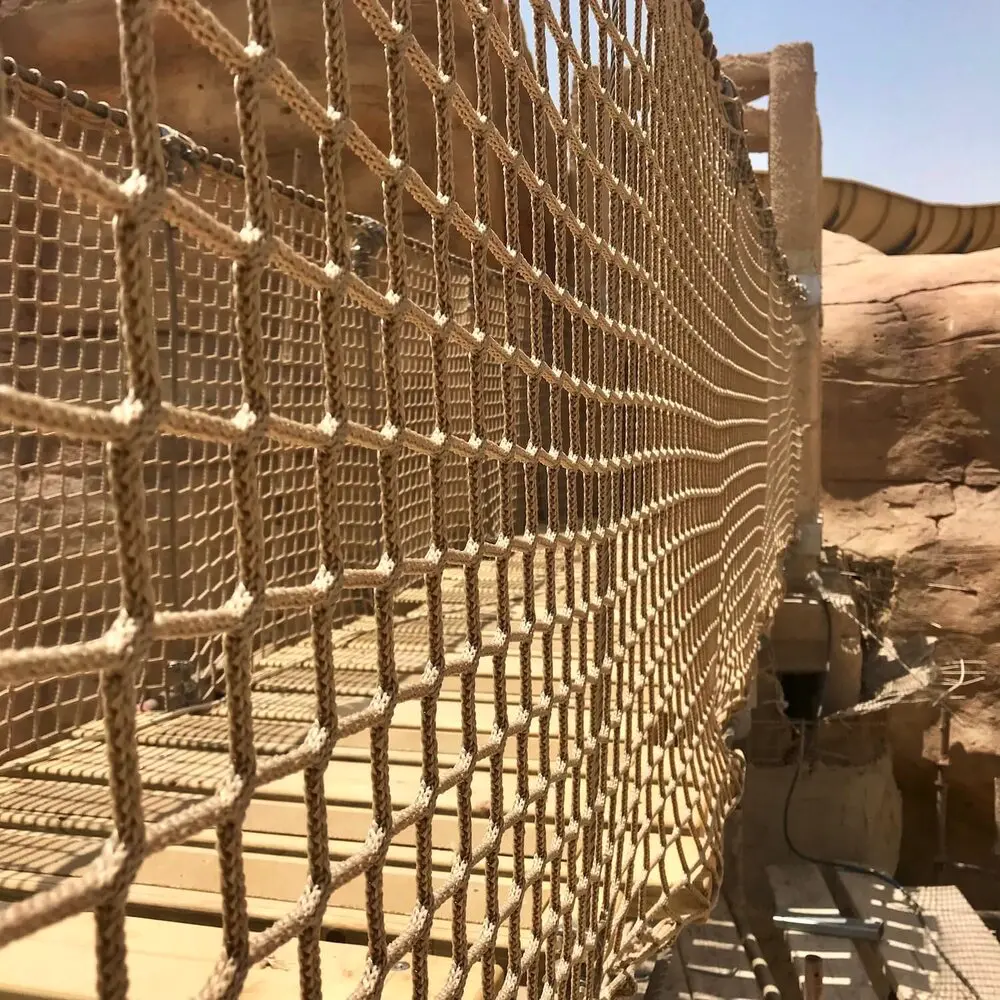An Adventure Park Rope Bridge in the Middle-East. A superb project built within a desert canyon in the heat of Qatar. Designed to look like a wild jungle-style Rope Bridge this creation is made with high-quality ropes and professional-grade metal supports. Sitting on tensioned metal cables and fixings it is strong, safe and easy to use. Finished with neutral-coloured rope netting and ropes it adds to the jungle feel and fun.