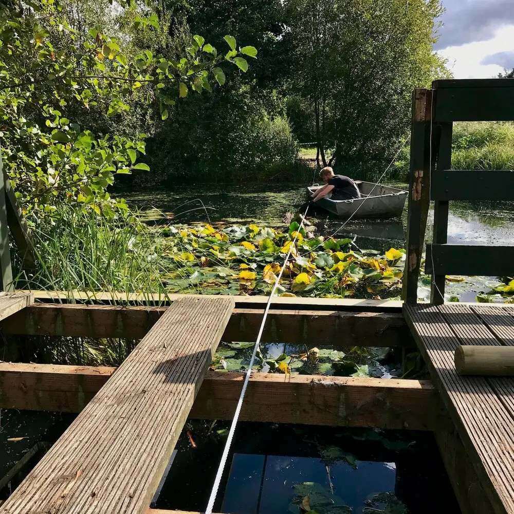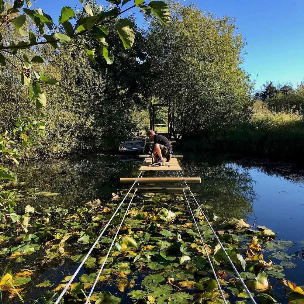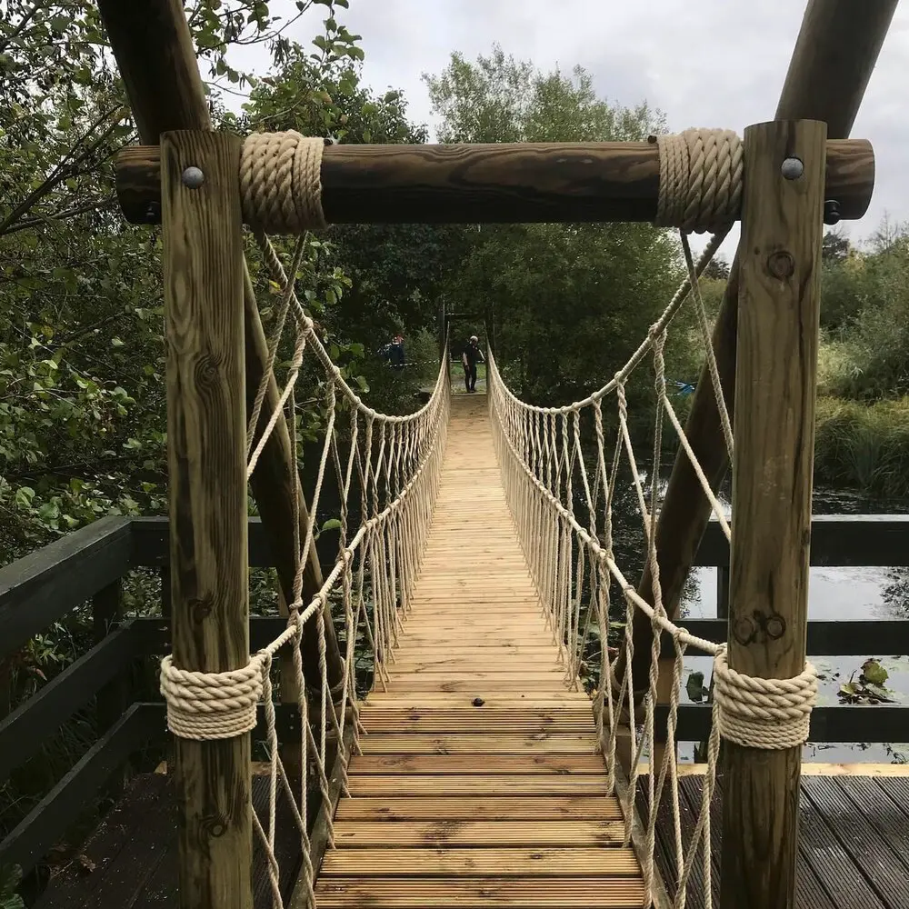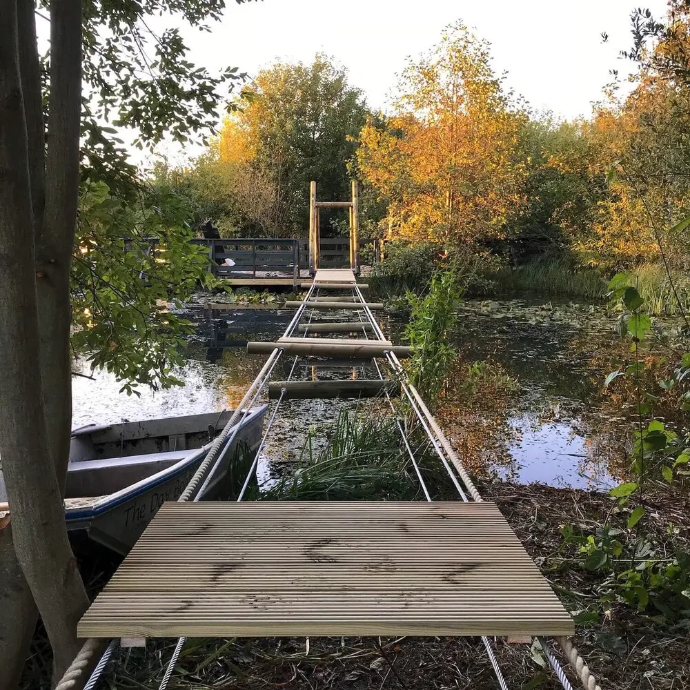 An amazing wetland Rope Bridge. Lake crossing Rope Bridge for the Wildfowl and Wetlands Trust park in London. An impressive project that required some serious engineering and design. This bridge is so enjoyable to cross and is built in a beautiful nature reserve. Skimming across the top of the water you walk in amongst the wildlife creating an exciting place to relax in and enjoy. Perfect for bird watching and fish creatures.